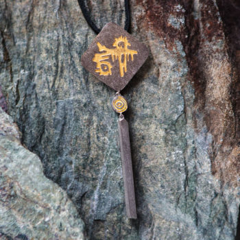 На пластину подвески нанесен фрагмент расписанных скал Калбак-Таша – комплекса с несколькими тысячами древних рисунков. Изображение взято с композицией и идеей: об изобилии жизни, силе, любви, заботе и таком, что увидите и поймете только вы.